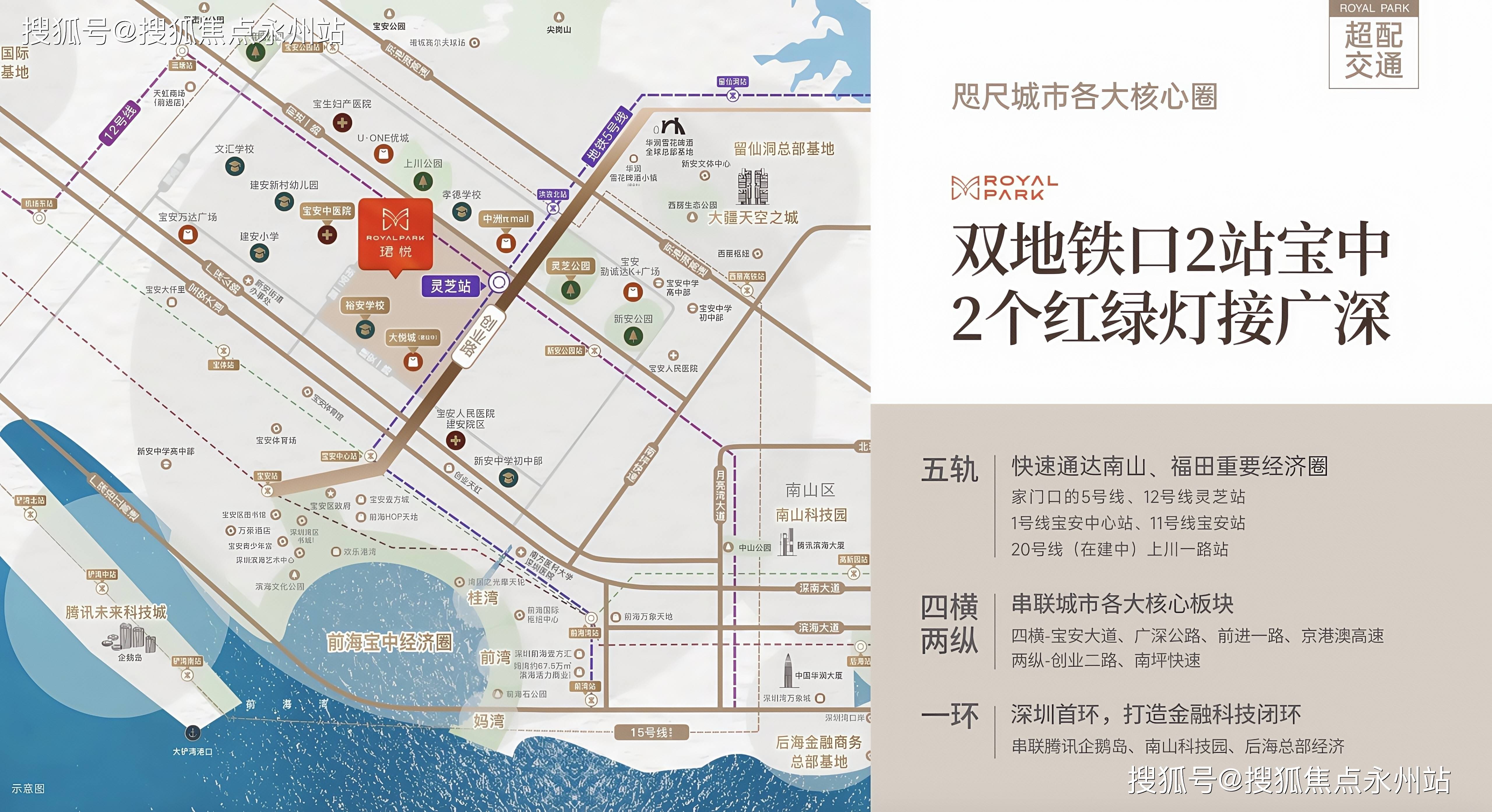 双地铁黄金交汇:项目为5号线号线灵芝站双地铁物业,步行约200-400米直达地铁站。5号线串联深圳北站、西丽枢纽,12号线连接南山科技园、蛇口自贸区,30分钟内可覆盖深圳湾总部基地、科技园等核心就业区。此外,灵芝站为深圳客流量前十站点,通勤效率高。