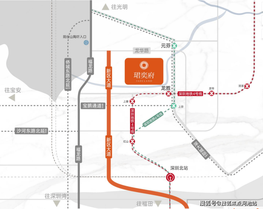 项目紧靠4号线龙胜站,周边有地铁4/5/6号线,以及新区大道、福龙路快速路等多条主干道。