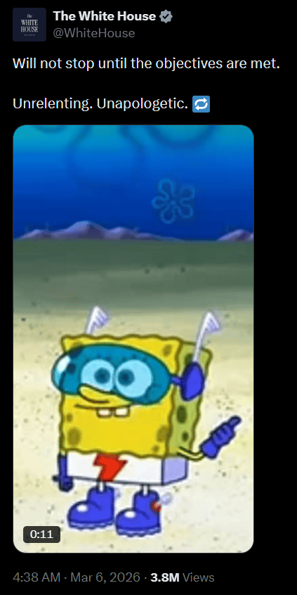 就在冲突爆发后几天,白宫的官方社交账号发布了多段有关美以对伊朗发动“史诗狂怒行动”的剪辑视频。3月5日的一段视频以射击游戏《使命召唤》开场,之后切到真实的导弹发射和爆炸画面。每次爆炸后都跳出游戏里的击杀分数,如“+100”。次日,卡通形象海绵宝宝在另一段视频中问:“要我再来一次吗?”画面随之转到线日,白宫又将电子游戏Wii Sports中不同游戏角色击球命中目标的画面与美军空袭的实拍片段混剪在一起,全程配以游戏背景音乐。