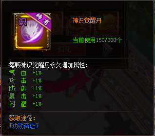 神识达到一定的阶数之后,可使用神识灵动丹、神识觉醒丹、神识飞升丹来增强神识的战斗力!