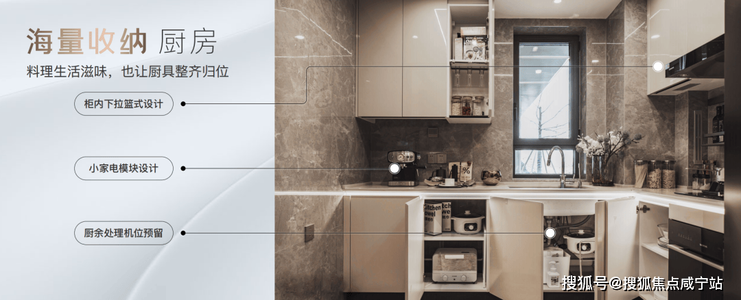 特别预置洗碗机点位、柜内下拉篮式设计、不锈钢挡油板、柜下操作灯、烹饪全流程功能动线一体化设计;