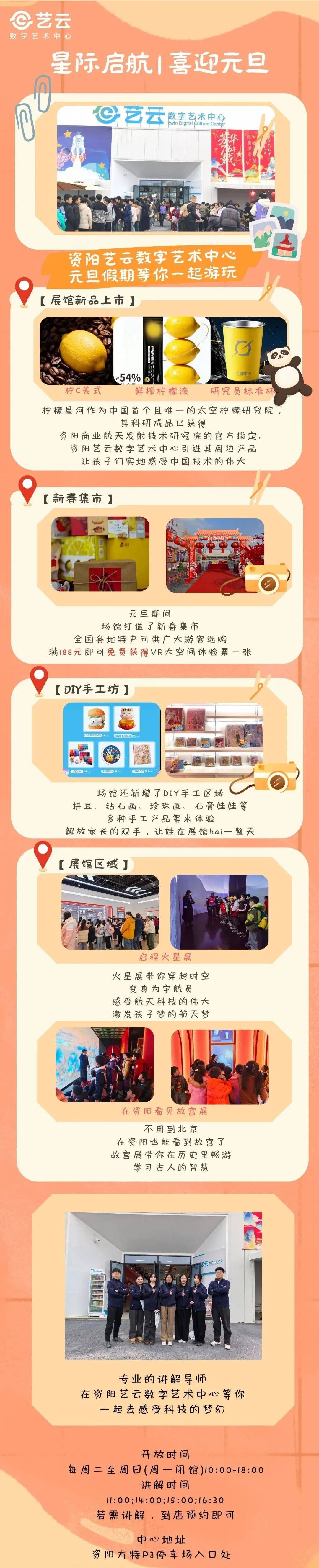 活动内容:元旦期间,场馆特别打造新春主题市集,汇聚全国特色风物,供游客选购。单笔消费满188元,即赠VR大空间沉浸体验券一张。现场新设DIY手工坊,提供拼豆、钻石画、珍珠画、石膏彩绘等手工创作体验,让孩子尽情探索,乐享整天。此外,游客还可品尝由资阳太空柠檬研究院研发的“柠檬星河”系列特色产品,感受科技与风味的奇妙融合。