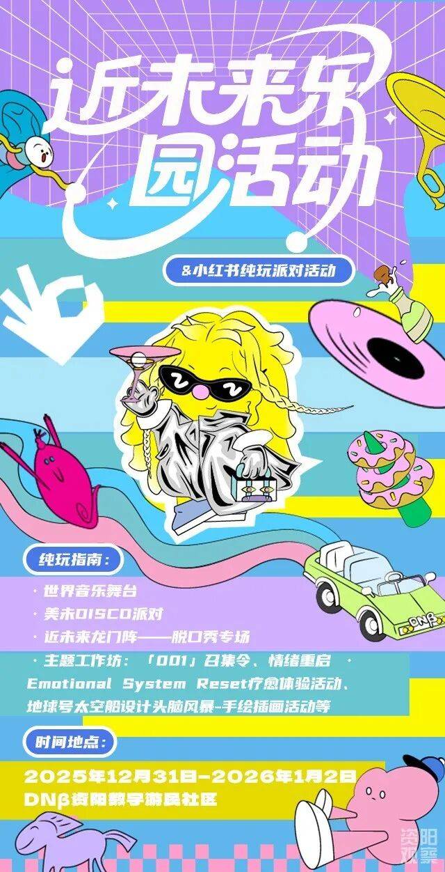 活动内容:举办近未来中心开业仪式与城市发布、主题体验工作坊。在DNβ观景台组织“世界音乐+自然风景”的开放式音乐会。以“青年、城市、生活方式”为主题组织演绎表演与脱口秀专场,穿插流动艺术表演。