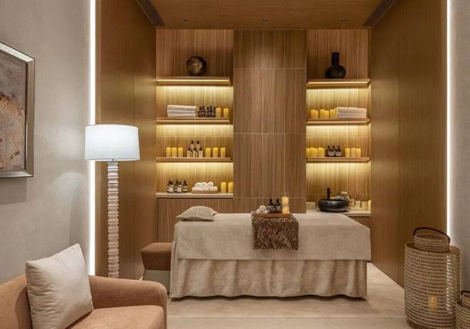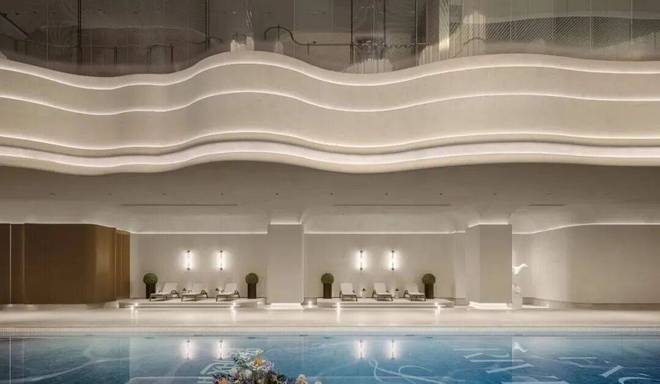 恒温泳池挑高约10米,营造出场馆级的开阔体验,顶部采光井将自然光引入池区,配合全地暖覆盖的更衣区与休息平台,整体对标重奢酒店的度假标准.